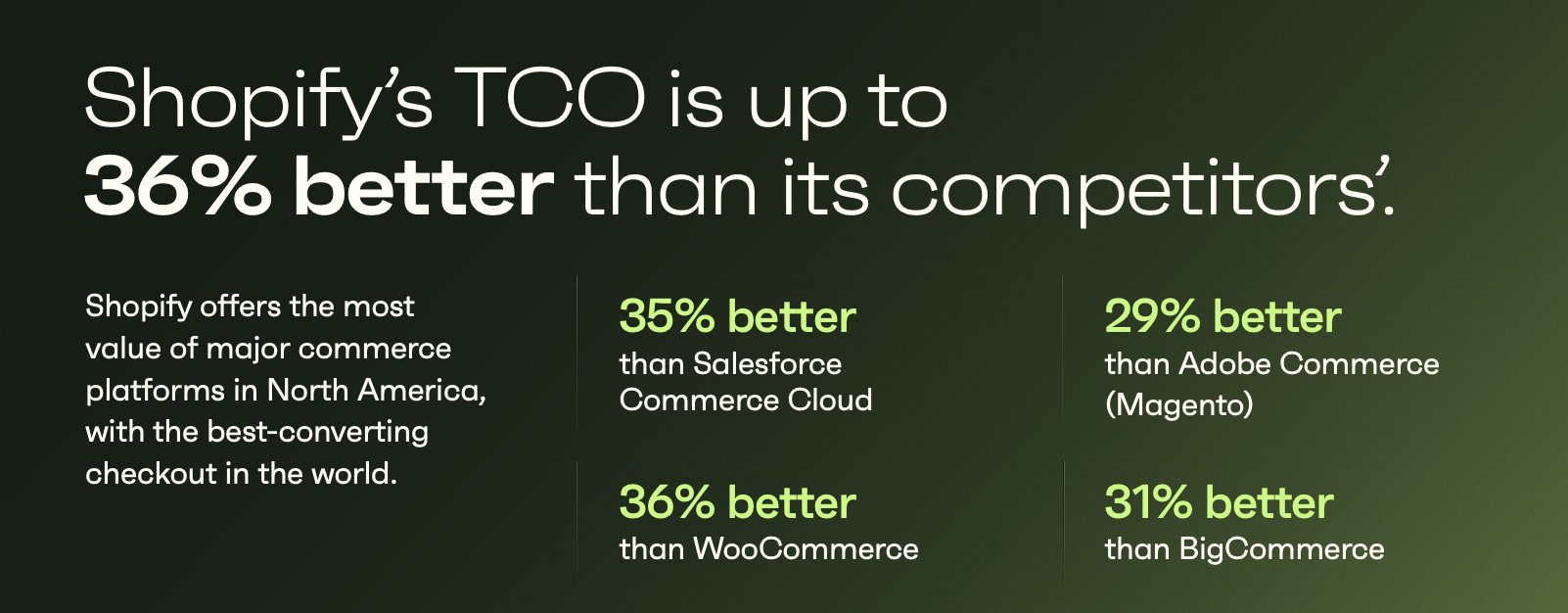 Quick Summary Shopify's TCO surpasses that of its competitors by an average of 33%, and in some cases, up to 36% better.