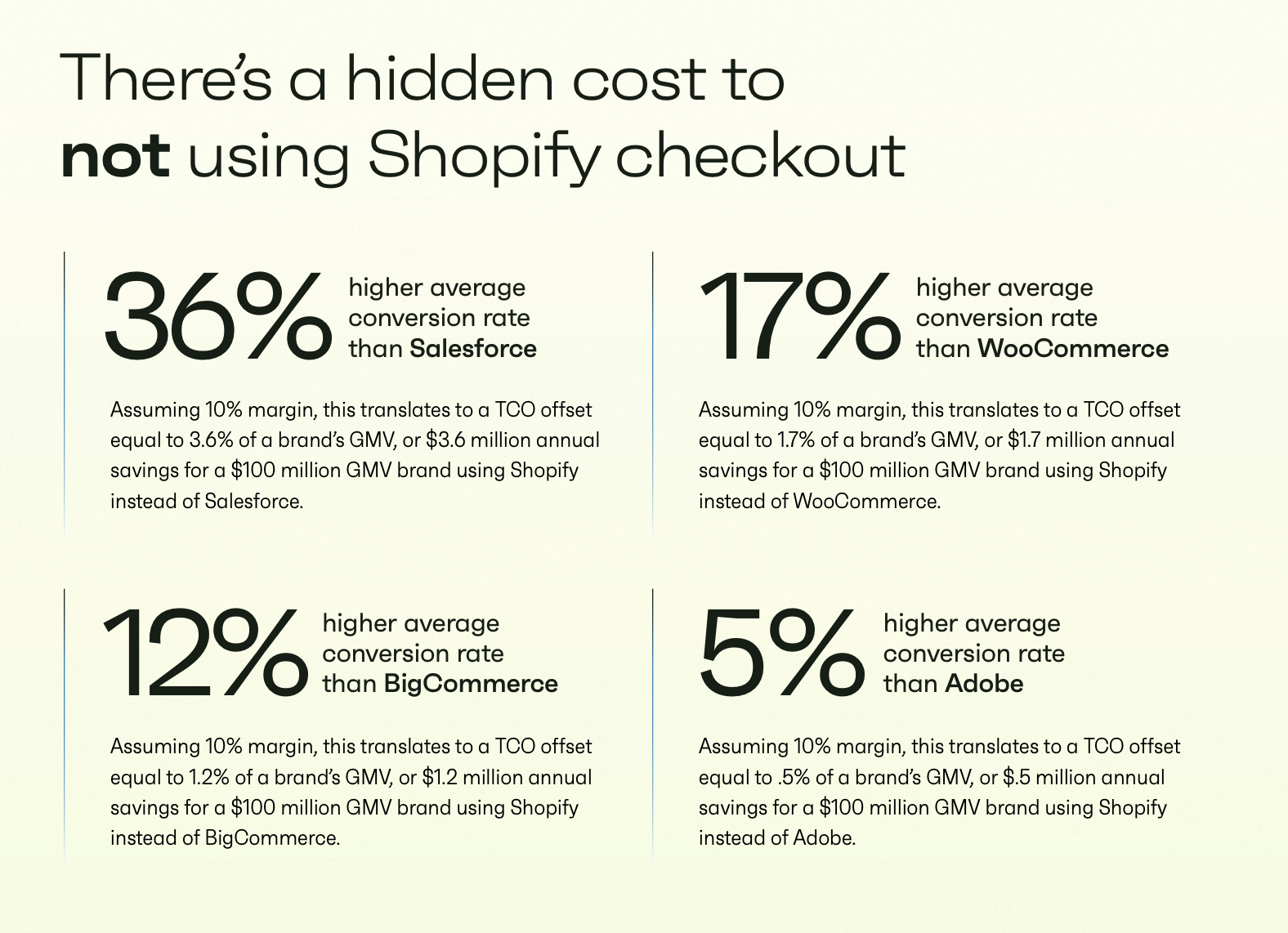 Shopify’s overall conversion rate exceeds that of the competition by up to 36%. When viewed as a percentage of TCO, assuming a 10% margin on goods sold, this equates to approximately a 1.8% TCO offset.